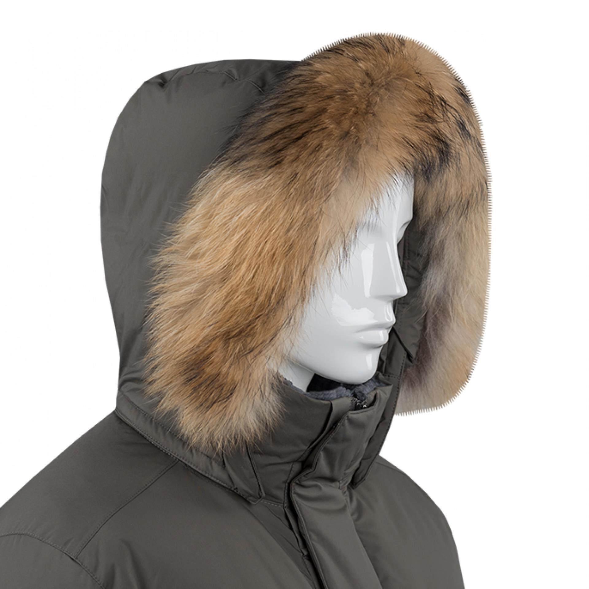 •Отстегивающийся теплый регулируемый капюшон с опушкой из натурального меха енота для дополнительной защиты лица от холода и ветра
