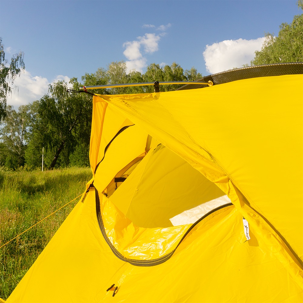 • 2 вентиляционных окна с ветрозащитными клапанами на тенте и молниями, что позволяет закрыть вентиляцию, не выходя из палатки;