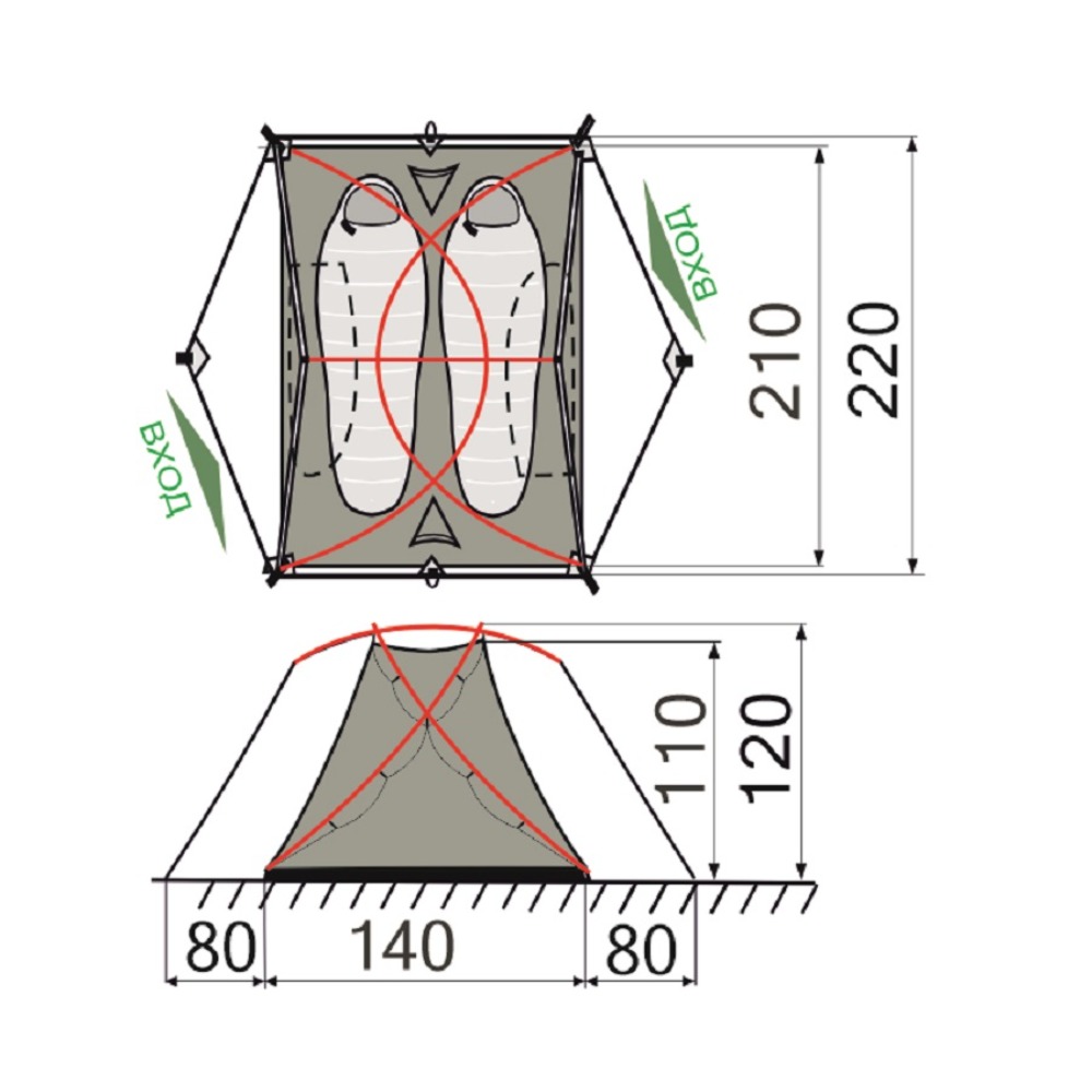 Размеры внутренней палатки (ДхШхВ): 210 х 140 х 110 см