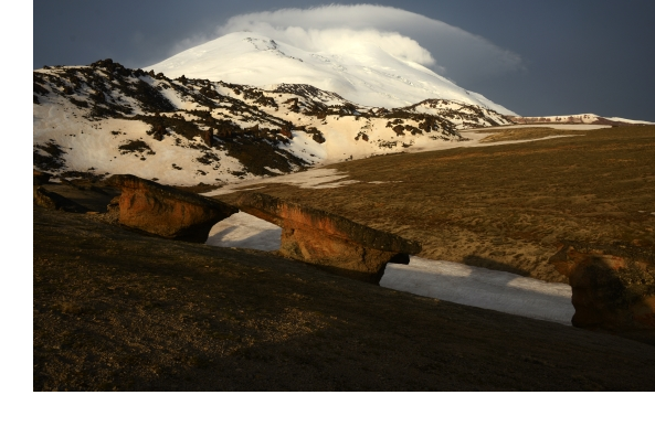 Переночевали в хижине. Когда стали собираться утром, увидели, как с юга от седловины на западную вершину идет первая тройка восходителей. Мы спускаемся на север, погода по-прежнему хорошая. Три года назад тропили по снегу, теперь, от скал Ленца, достаточно жесткий фирн, мышцы на ногах забиваются. Идем связанные. Впереди зелень предгорий, резкий контраст со снегом, по которому идем. В лагере Лакколит на 3800 народу мало, несколько гидов, говорят клиентов еще нет. Весна в этом году в Приэльбрусье наступила поздно, если три года назад от лагеря спускались по тропе, то теперь часть тропы до Лунной поляны почти вся в снегу, идем регулярно проваливаясь, да и на самой Лунной поляне регулярно встречаются участки глубокого раскисшего снега. Где- то примерно к 12 дня дошли до «грибов», это хорошее место для релакса, как и три года назад, встали на стоянку. Прогулялся на соседний отрог, на котором при спуски к «грибам» увидел озера. Погода до вечера стояла хорошая, но к вечеру начала портиться и к утру испортилась совсем. Когда вылезли из палатки Эльбрус еще было видно, но, когда уходили вниз – уже нет. Небо стало равномерно серым, подул ветер. Так что нам явно повезло, мы попали в погодное окно.