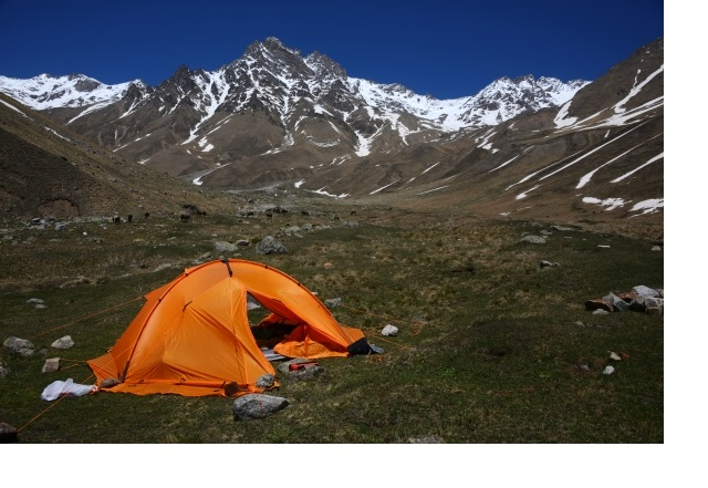 На следующее утро выходим на маршрут. Высота 1750 м, до так называемых песчаных замков крутой подъем, дальше до слияния рек Ирик-Чат и Ирик приятная тропа по сосновому лесу с небольшим набором высоты. Ближе к слиянию, над долиной Ирика, открывается вид на Эльбрус, хорошо виден путь подъема по лавовому потоку и боковой кратер. Погода все так же прекрасна. На слиянии лес заканчивается, в последних соснах стоянки, рядом водопад. Чуть дальше – кош, вокруг него очень грязно. Кош пустой, массовый выгон скота на пастбища, по счастью, еще не начался. Юра говорит, что летом тут намного грязнее. Долина Ирик -Чата – висячая долина, сразу от коша начинается крутой подъем в нее, тропа становиться заметно хуже. Преодолеваем взлет, высота 2650 м, ставим лагерь. На юг открываются виды на вершины ГКХ – Бжедух, Вольная Испания, Уллукара. После обеда прогулялся вверх до начала снежников.