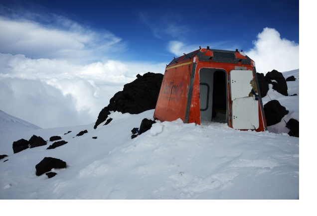 В хижине на седловине ночевали три года назад, когда ходили с запада. За это время ее сильно «ушатали». Входная дверь наполовину сломана (хорошо, хоть вторая цела), внутри самой хижины на полу ровным слоем лежит спрессованный, заледенелый снег, высотой сантиметров тридцать. Попытки очистить пол хижины от снега лавинной лопатой ни к чему не привели, лопата не смогла разбить этот снеголед. Печально видеть такое отношение к укрытию, которое предназначено в общем-то для спасения жизни людей.