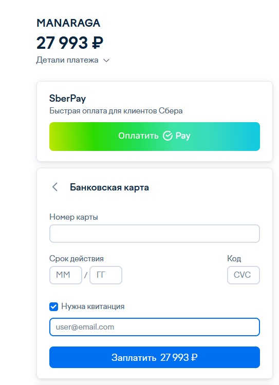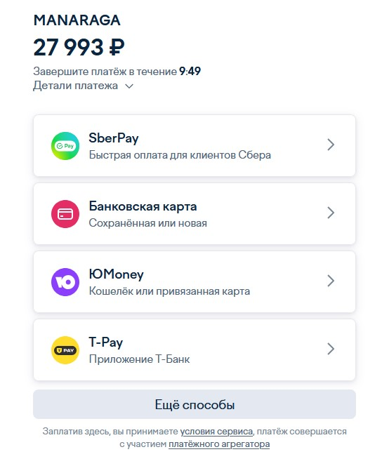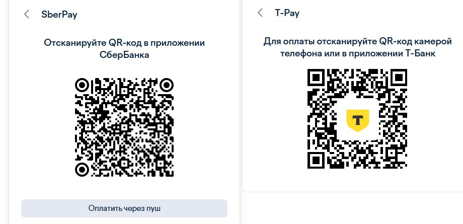 Клиентам Т-банка или Сбера достаточно выбрать способ оплаты T-pay / SberPay, отсканировать появившийся штрихкод и завершить оплату в приложении Вашего банка без ввода реквизитов банковской карты.
